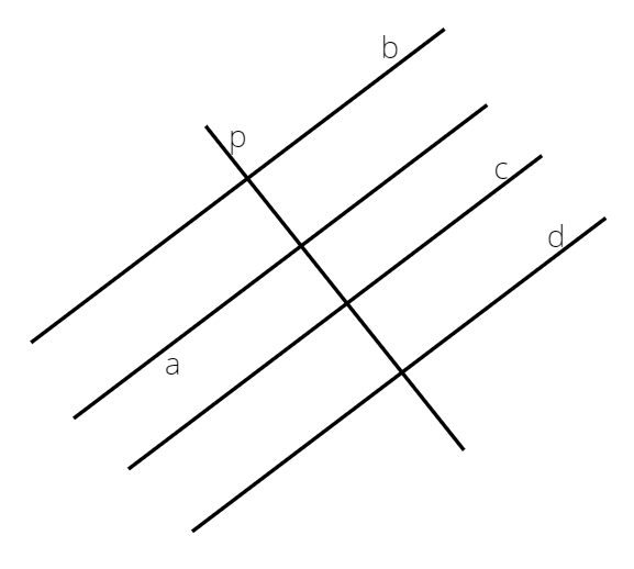 Za pomocą ekierki narysuj trzy proste, które są pod kątem prostym do prostej p oraz rozstrzygnij, czy proste a, b, c, d, p są równoległe lub prostopadłe do siebie.