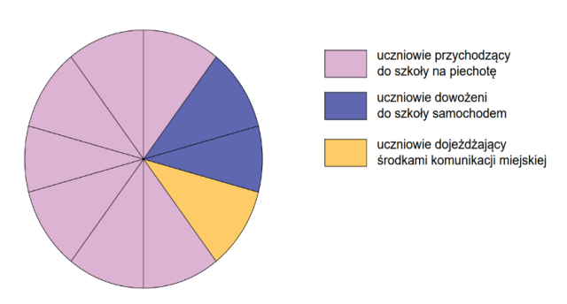 Zauważ, że diagram podzielony jest na 10 części, jedna część diagramu to 10%. Ponieważ uczniów przychodzących do szkoły na piechotę jest 70%, dlatego w tym przypadku musisz zamalować 7 części. Uczniów dowożonych samochodem jest 20%, dlatego należy zamalować 2 części. Pozostała część to uczniowie dojeżdżający środkami komunikacji miejskiej – jest ich 10%.