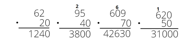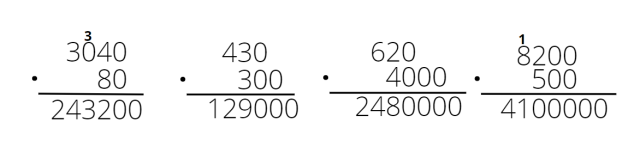 Pomnóż pisemnie czynniki bez zer, tak jak to robiłeś na poprzedniej lekcji. Po policzeniu do wyniku dopisz tyle zer, ile znajduje się łącznie na końcu w obu czynnikach.