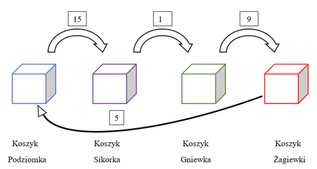 Po przekładaniu żołędzi w każdym koszyku było po 36 żołędzi.
