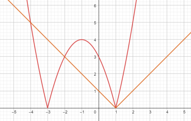 Aby rozwiązać równanie metodą graficzną, naszkicuj wykres funkcji reprezentującej lewą stronę równania (kolor czerwony) i prawą (kolor pomarańczowy). Rozwiązaniami równania są argumenty, dla których wykresy funkcji się przecinają.