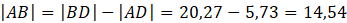 Długość odcinka AC wyznacz za pomocą sinusa kąta DAC i długości odcinka CD. Następnie oblicz długość odcinka AD (tangens kąta DAC i długość CD). Kolejno długość odcinka BD (tangens DBC i długość DA), od której odejmij długość AD otrzymując długość boku AB. Na koniec korzystając z wartości sinusa kąta DBC i długości odcinka CD oblicz długość odcinka BC.