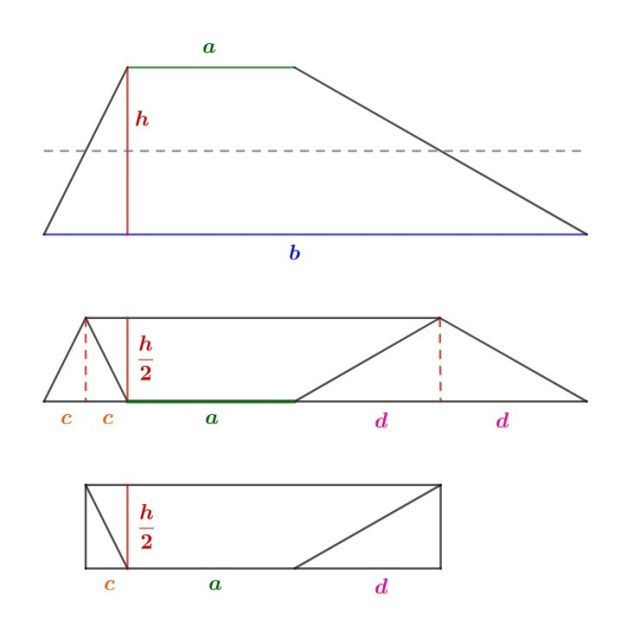 Otrzymana figura to prostokąt, które boki to: połowa wysokości trapezy oraz bok o długości
