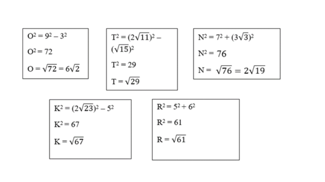 Wiedząc, że a2 + b2 = c2 (tw. Pitagorasa), oblicz boki trójkątów o wskazanych nazwach (O, T, N, K, R) i podstaw obliczone wartości do danych w tabelce.