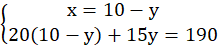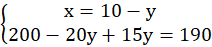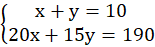 Oznacz ilość biletów normalnych jako x, a ulgowych jako y. Ułóż układ równań. W pierwszym równaniu napisz sumę biletów normalnych oraz ulgowych, dającą wynik 10. W drugim równaniu napisz sumę ilości biletów pomnożonych odpowiednio przez ich cenę, dającą wynik 190.