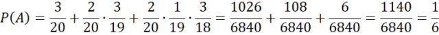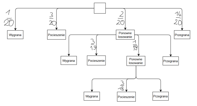 Wyznacz prawdopodobieństwo wygrania nagrody pocieszenia, jeśli kupimy jeden los, a wśród 20 losów loterii fantowej są 4 losy uprawniające do odebrania jednej z nagród (jest 1 nagroda główna i są 3 nagrody pocieszenia) oraz 2 losy uprawniające do dalszego losowania.