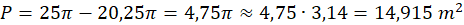 Oblicz pole powstałego pierścienia kołowego. Odejmij od pola większego koła, pole mniejszego.