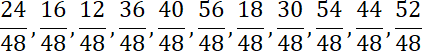 Pomnóż liczniki i mianowniki kolejno przez: 24, 16, 12, 12, 8, 8, 6, 6, 6, 4 i 4.