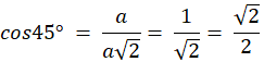 Cosinus kąta ostrego to stosunek długości przyprostokątnej przyległej do tego kąta do długości przeciwprostokątnej. W przypadku kiedy kąt ma miarę 45° mamy do czynienia z trójkątem prostokątnym równoramiennym (o boku a). Stosujemy twierdzenie Pitagorasa i obliczamy długość przeciwprostokątnej. Następnie wyznaczamy cos45°.