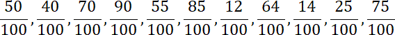 Pomnóż liczniki i mianowniki kolejno przez: 50, 20, 10, 10, 5, 5, 4, 4, 2, 25 i 25.
