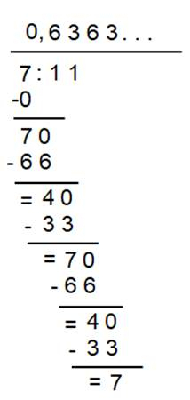 Na podstawie poniższych obliczeń, wyraźnie widać, że można by się zapętlić w notorycznym odejmowaniu dwóch par liczb, więc używamy zapisu ułamka okresowego.