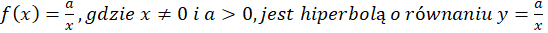 Wykres funkcji postaci przechodzi przez punkt (1, a), więc jeżeli a jest większe od zera, to punkt ten leży w I ćwiartce. Zauważ, że jeżeli hiperbola leży w I ćwiartce, to leży też w III.