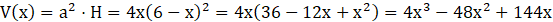 Z arkusza, w kształcie kwadratu o boku 12 dm, wycięto w narożnikach kwadraty o bokach długości x cm. Pozostałą część sklejono i otrzymano pudełko Opisz objętość pudełka za pomocą wielomianu zmiennej x.