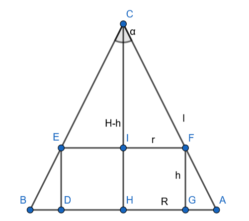 Dwukrotnie skorzystaj ze wzoru na tangens kąta w trójkącie prostokątnym i z powstałego równania wyznacz długość wysokości i promienia stożka. Na koniec oblicz jego objętość.