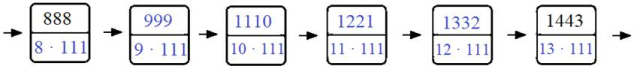 Uzupełnij okienka kolejnymi wielokrotnościami liczby 111 i odpowiednimi iloczynami, a następnie uzupełnij działania pod okienkami.