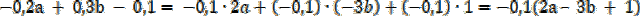 Zauważ, że -0,2a, 0,3b i -0,1 mają wspólny czynnik liczbowy, który można wyciągnąć przed nawias: