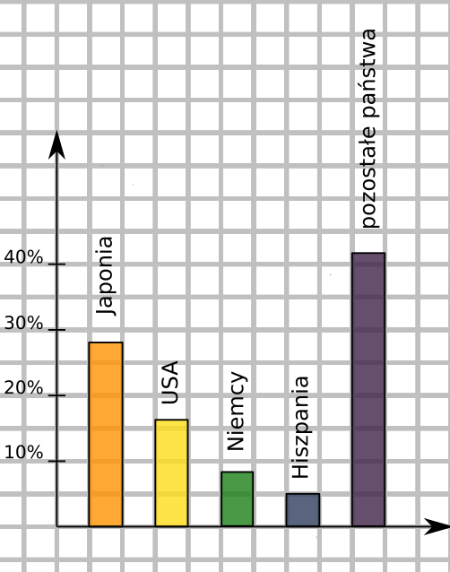 Zauważ, że jeden mały kwadrat na diagramie odpowiada jednemu procentowi. Narysuj słupki, których wysokości będą odpowiadały procentom przypadającym poszczególnym państwom.