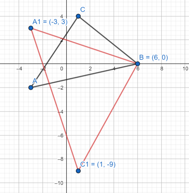 Trójkąt ABC zaznaczony jest kolorem czarnym, jego obraz (A1BC1) zaznaczony jest kolorem czerwonym.