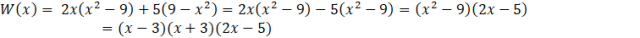 Aby rozłożyć wielomian na czynniki, wyłącz najpierw przed nawias -1 z wyrażenia 9 – x2. Następnie wyłącz w całym wyrażeniu przed nawias czynnik x2 – 9 oraz skorzystaj ze wzoru skróconego mnożenia na różnicę kwadratów.