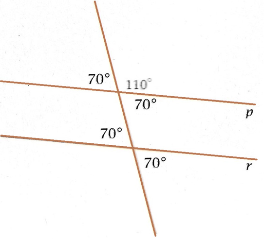 Ponieważ proste p oraz r są równoległe, przecinają się z dorysowaną prostą pod tymi samymi kątami. Korzystając z własności katów przystających i dopełniania do kąta półpełnego, zaznaczamy odpowiednie kąty.