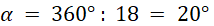 Wiedząc, że na rysunku przedstawiony jest osiemnastokąt foremny, wylicz miary oznaczonych kątów.