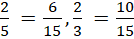 Należy sprowadzić ułamki zwykłe do wspólnego mianownika; możesz tego dokonać szukając NWW liczb z mianowników, NNW liczb 5 i 3 to 15. Należy więc rozszerzyć ułamki tak, by otrzymać 15 w mianowniku (pamiętaj o równoczesnym rozszerzaniu licznika); otrzymasz