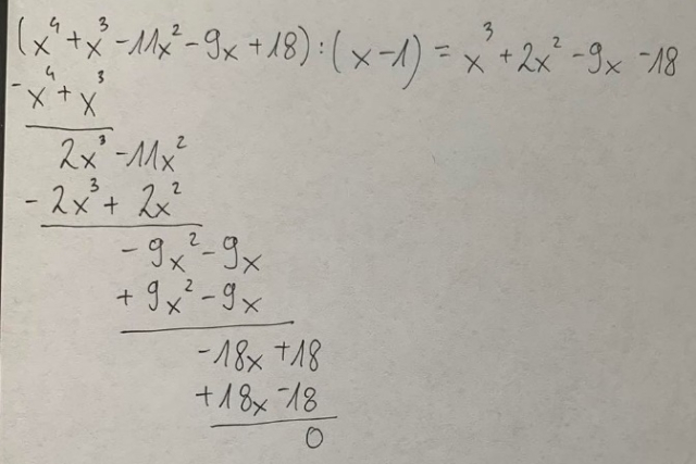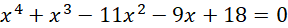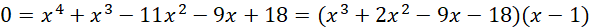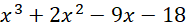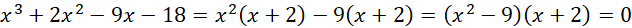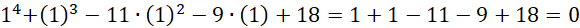 Znajdź pierwiastek całkowity wśród dzielników wyrazu wolnego tj. -18, -9, -6, -3,-2, -1, 1, 2, 3, 6, 9, 18.