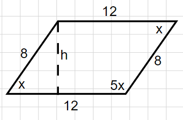 W tym ćwiczeniu musisz obliczyć pole równoległoboku, wiedząc że jego boki mają długość 8 i 12, , a kąt rozwarty jest pięć razy większy od kąta ostrego.