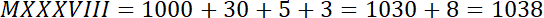 Liczba MXXXVIII jest sumą liczb: M (1000), XXX (30), V (5), III (3).