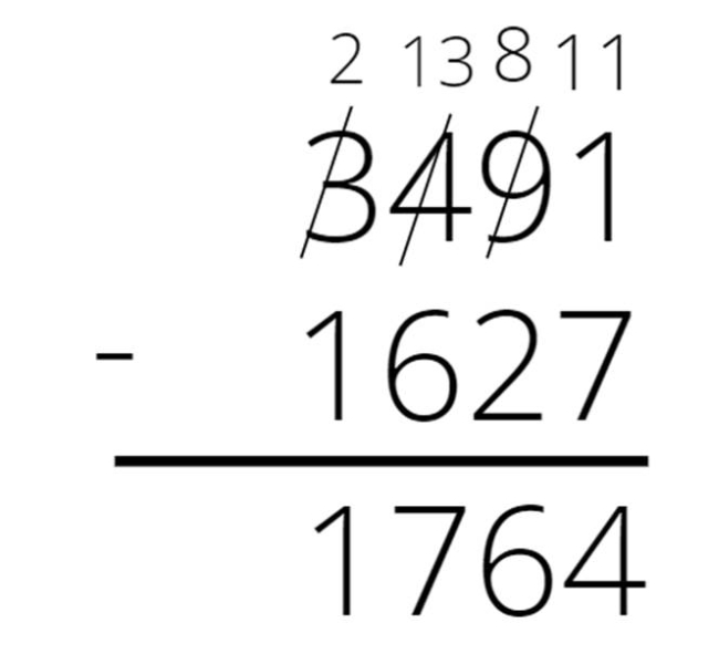 Zapisz liczby jedna pod drugą. Odejmuj kolumnami. Jeśli cyfra górna jest mniejsza od dolnej, to dodaj do niej 10, a cyfrę po lewej stronie zmniejsz o 1 i wykonaj odejmowanie na nowo powstałych liczbach.