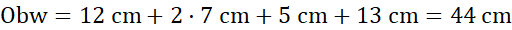 Pamiętaj, że obwód danej figury to suma długości jego wszystkich boków. Zwróć uwagę, że musisz dodać do siebie jedynie boki na zewnątrz figury zbudowanej z prostokąta i trójkąta prostokątnego. W prostokącie boki leżące naprzeciwko siebie mają taką samą długość – pomnóż szerokość prostokąta przez 2, a następnie dodaj wartość długości prostokąta, krótszej przyprostokątnej i przeciwprostokątnej trójkąta.