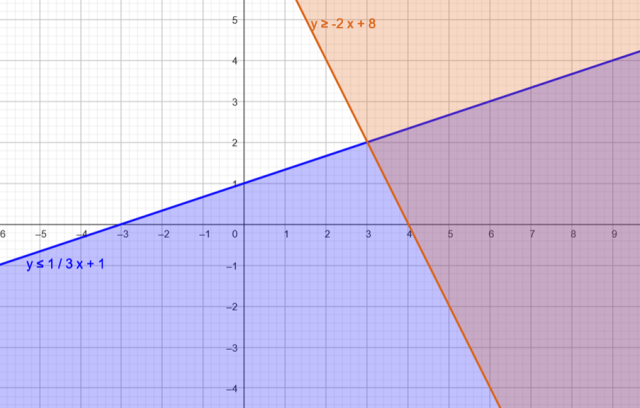 Zbiorem rozwiązań układu równań, będzie część wspólna nierówności oznaczona kolorem fioletowym.