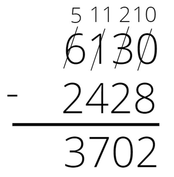 Zapisz liczby jedna pod drugą. Odejmuj kolumnami. Jeśli cyfra górna jest mniejsza od dolnej, to dodaj do niej 10, a cyfrę po lewej stronie zmniejsz o 1 i wykonaj odejmowanie na nowo powstałych liczbach.