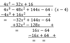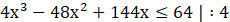 Po jednej stronie nierówności stawiamy wzór na V, a po drugiej ustaloną liczbę 64. Przenosimy wszystkie wyrazy na jedną stronę i szukamy miejsc zerowych powstałego wielomianu. W odpowiedzi podajemy część wspólną rozwiązań nierówności oraz dziedziny funkcji V.