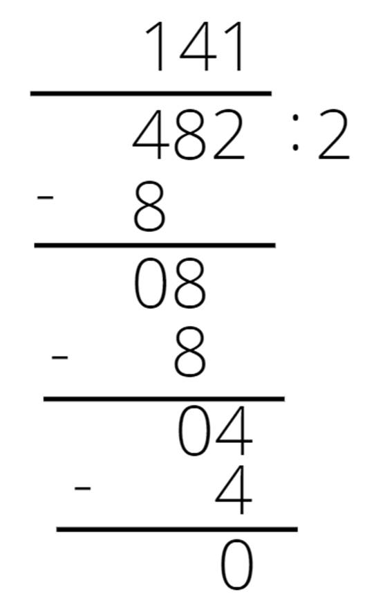 Sprawdź, ile razy mieści się pierwsza cyfra w dzielniku. Wynik zapisz nad kreską nad naszą cyfrą. Pomnóż zapisaną liczbę przez dzielnik i zapisz wynik pod pierwszą cyfrą. Zapisz pod tą liczbą kreskę i odejmij powyższe dwie liczby. Do uzyskanego wyniku dopisz kolejną cyfrę dzielnej i znowu sprawdź, ile razy mieści się ta liczba w dzielniku. Wynik zapisz nad kreską nad naszą cyfrą. Pomnóż zapisaną liczbę przez dzielnik i zapisz wynik pod drugą cyfrą. Zapisz pod tą liczbą kreskę i odejmij powyższe dwie liczby. Jeśli dzielna to liczba trzycyfrowa, to postępuj tak samo w wypadku trzeciej cyfry.