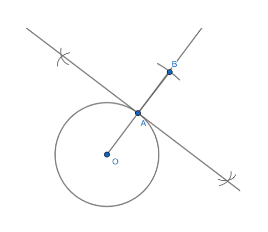 W tym zadaniu skorzystaj z podpowiedzi z treści zadania, ustaw rozstaw cyrkla na szerokość większą, niż promień: |OA|, cyrkiel wbij w punkt O i B, kreśląc przecinające się łuki i poprowadź prostą k przez punkty przecięcia łuków. Prosta k jest styczna do okręgu w punkcie A i jest symetralną odcinka OB.