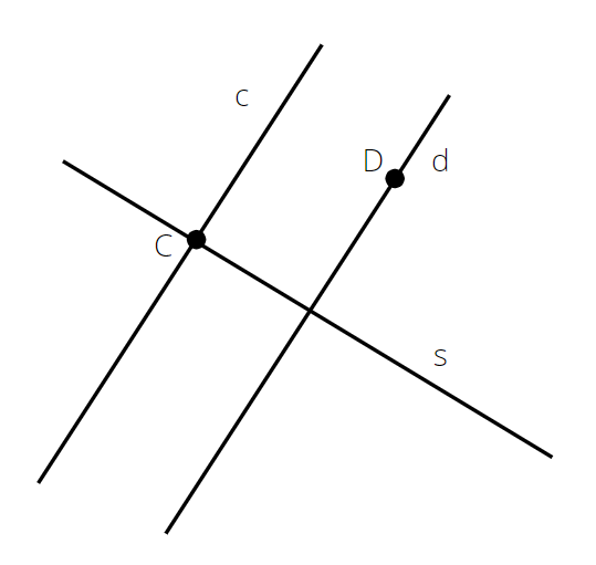 Proste c i d będą prostopadłe do prostej s i równoległe do siebie. Przyłóż do prostej s ekierkę i narysuj proste tak, aby przechodziły przez punkty C i D.