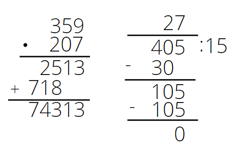 W tym zadaniu musisz odgadnąć liczby, jakie należy dopisać. Pomocne może być zaczynanie od końca, to znaczy pomyśl nad dodawaniem w mnożeniu pisemnym i jakie liczby należy dodać, by otrzymać podane liczby. W dzieleniu możesz zacząć od tego, że skoro reszta z dzielenia wynosi 0, to nad liczbą 105 musi być ta sama liczba.