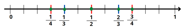 Podziel odcinek na 2, 3 i 4 części i zaznacz ułamki. Na podstawie położenia na osi porównaj je.