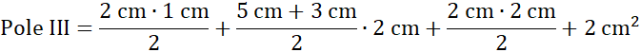 Figura III składa się z dolnego trapezu równoramiennego o podstawach 5 cm i 3 cm i wysokości 2 cm oraz dwóch trójkątów prostokątnych o przyprostokątnych 2 cm i 2 cm oraz 1 cm i 2 cm oraz dwóch pojedynczych kwadracików.