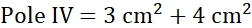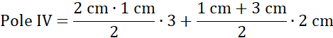 Figura IV składa się z trapezu prostokątnego o wysokości 2 cm i podstawach 1 cm i 3 cm oraz trzech trójkątów prostokątnych o przyprostokątnych długości 2 cm i 1 cm.