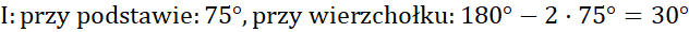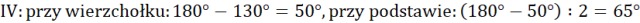 W tym ćwiczeniu musisz obliczyć podane kąty, wiedząc, że suma katów w trójkącie wynosi 180°, a kąty przy czarnym boku są sobie równe.