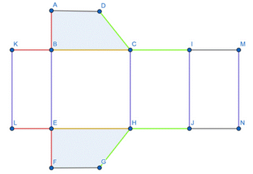 Podana siatka graniastosłupa zawiera 4 równe krawędzie czerwone, 4 równe krawędzie zielone, 4 równe szare, 2 równe żółte i 5 równych fioletowych.