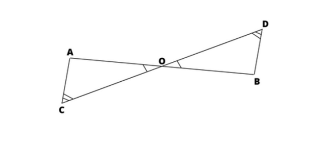 AC = BD z założenia, kąt AOC = kąt BOD, ponieważ są to kąty wierzchołkowe, kąt ACO = kąt BDO, ponieważ są to kąty naprzemianległe, więc kąt CAO = kąt DBO, kąt CAO = kąt DBO, co wynika z równości pozostałych kątów rozważanych trójkątów
