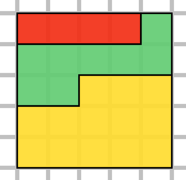 W tym zadaniu musisz pomalować na czerwono, zielono oraz żółto kwadrat o boku 5 kratek i powiedzieć, jaką część kwadratu pomalowałeś na jaki kolor. Na czerwono i zielono musisz pomalować odpowiednio 4 i 8 kratek.