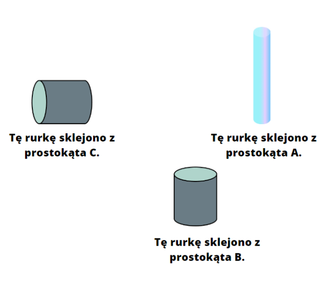 Rurki pokazane na rysunkach zostały sklejone z prostokątów o nazwach A, B, C. Zapisz pod odpowiednimi rurkami odpowiednią nazwę prostokąta, z którego została wykonana.