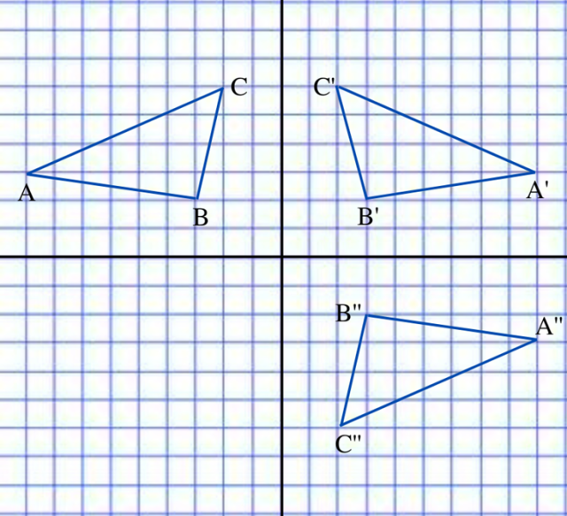Trójkąty ABC i A’’B’’C’’ są symetryczne względem punktu przecięcia się osi pionowej i poziomej.