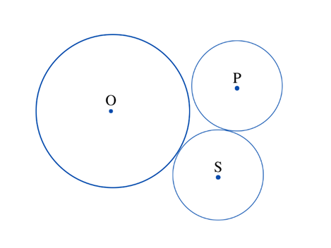 Do tego zadania potrzebujesz linijki oraz cyrkla. Zmierz odległość pomiędzy punktami P i S i podziel ją na pół (wynikiem jest promień), ponieważ okręgi te są styczne. Narysuj okręgi o otrzymanym promieniu, a następnie ułóż cyrkiel na środku O i punkcie styczności z okręgiem S i narysuj trzeci okrąg.