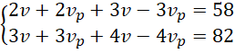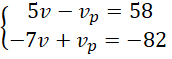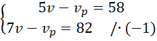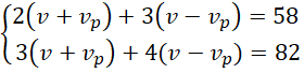 Wyznacz prędkość własną łodzi oraz prędkość prądu rzeki, jeśli pierwszego dnia łódź płynąca 2 godziny z prądem rzeki, a następnie 3 godziny pod prąd, przebyła trasę długości 58 km. Drugiego dnia płynąc 3 godziny z prądem i 4 godziny pod prąd, przypłynęła trasę o długości 82 km.