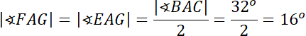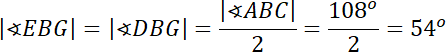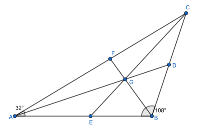 Następnie zauważ, że dwusieczna dzieli kąt na dwa o takiej samej mierze i na tej podstawie oblicz miary kątów w trójkącie ABC na jakie dwusieczne je podzieliły.